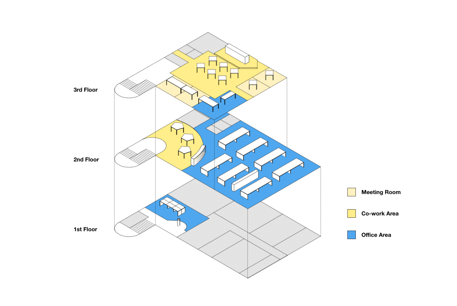 エントランスには「光」を感じさせる演出に加え、ロゴの曲率に合わせてやわらかい印象をもたらす壁をあしらいました。執務や会議のスペースとなる2階と3階は、視線が通り抜けるオープンな空間を設計。より開放感が味わえるように天井を意匠的に抜くだけでなく、フリーアドレス化にすることで、人の流動性が高まるよう、空間をデザインしました。