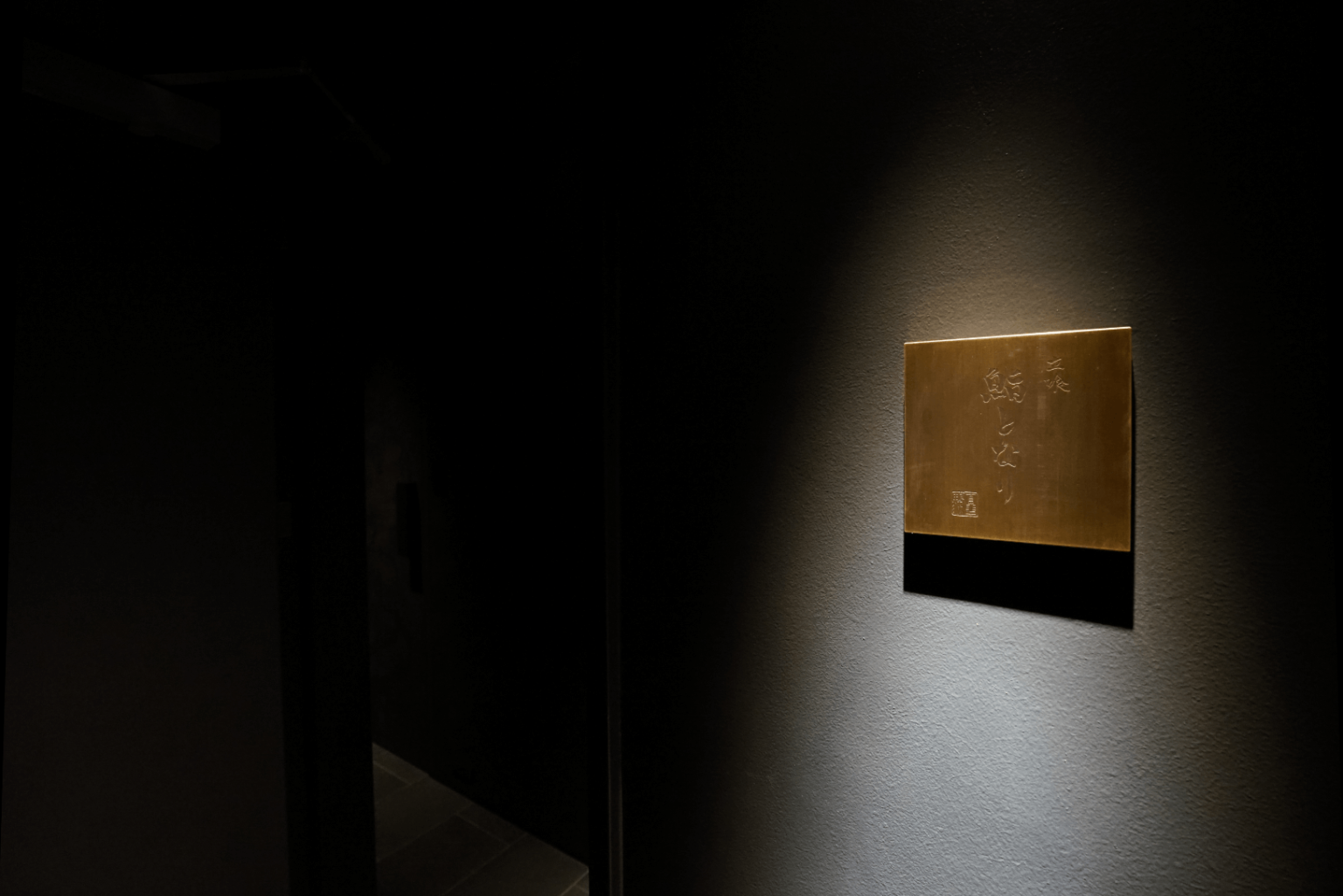 内装は黒に近いトーンを基調としながら、細やかな色彩の使い分けや味わいある特殊な塗料を用いて、動きと奥行きを豊かに演出。ゴールドをアクセントカラーに配色することで、品格と遊び心の趣を絶妙なバランスで両立させています。無垢のカウンター上で供される鮨にはスポットライトを照らし、まるでステージのように見立て、江戸前の技術と味を際立たせる演出で彩りました。